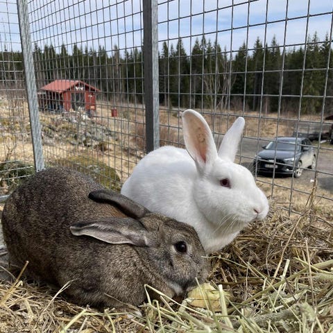 Två långhåriga kaniner med fluffig päls, blandning mellan angora och lejonhuvud söker nytt hem. Hålls ute i bur nu och är vana vid utegård året runt.