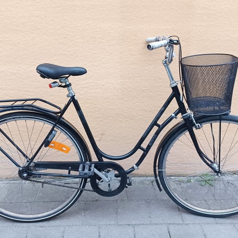 Helt genomgången cykel där allt fungerar. Bromsar fram o bak. Belysning. Bra däck utan sprickor. Upprätt körställning. Fast lås. Priset har ingen prutmån.