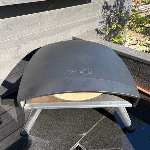 Gasdriven 12” pizzaugn från Austin and Barbeque i rostfritt stål med skorsten och värmereglage på baksidan. Invändigt finns pizzasten och på bilderna syns även skyddsoöverdrag och pizzaspade från Weber.