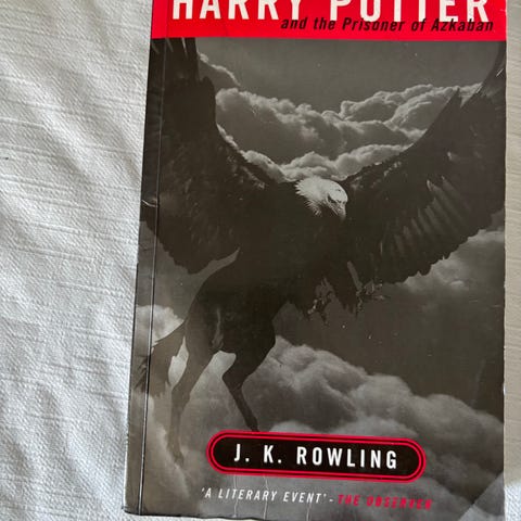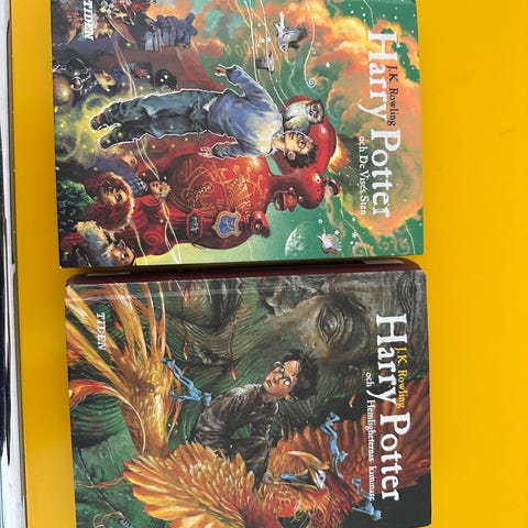 Två Harry Potter-böcker av J.K. Rowling på engelska: Half-Blood Prince och Deathly Hallows i pocket. Färgglada omslag med illustrationer fram och text på baksidan.