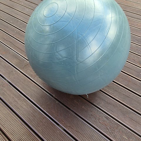 Blå balansboll med två träningsband med handtag. Bra för balans- och styrkeövningar hemma på golvet.