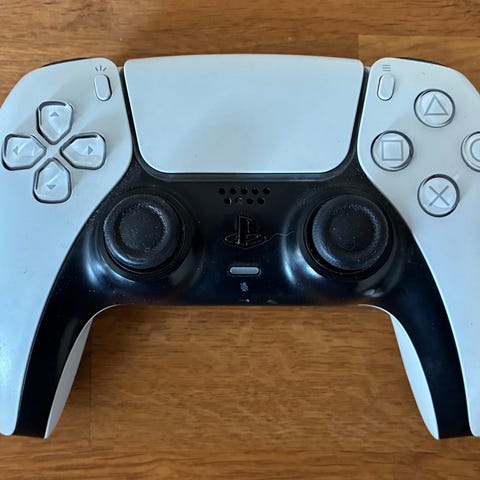 Sony DualSense handkontroll till PS5 i vit färg. Trådlös kontroll med inbyggd touchpad och flera knappar och spakar som syns på bilderna.