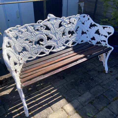 Vit gjutjärnssoffa med ormbunksmotiv med träsits. Vissa skönhetsfläckar men på det stora hela i bra begagnat skick.