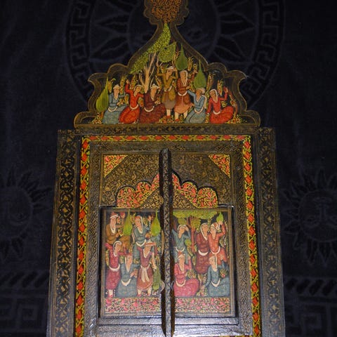 Vacker trälykta med utskurna detaljer och målade paneler på sidorna. Har flera röda tofsar som hänger ner och ger fint intryck när den hängs upp.