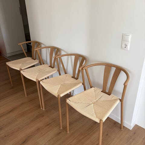 Säljer 4 stycken fantastiskt fina och stabila stolar med vackert svängda ben. Stolarna har en bred och mycket bekväm sits som gör att man gärna sitter kvar länge vid middagsbordet.