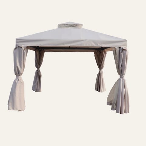 Paviljong med plasttak och gardiner för altan