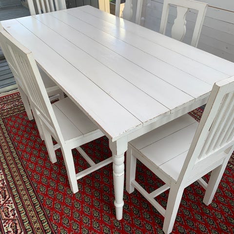 Mat bord 4 st pinn stolar finns i läggs skiva längd utan skiva 135 bredd 83 skiva 40 finns nått märke på bords skivan färgskav helt och stabilt