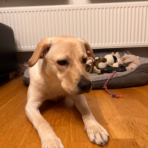 Bara han få bo in sig i sin nya familj kommer ni få en toppen hund. Han sover gärna i sängen med sin familj. Funkar med barn och katter.tikar funkar bra stora som små.han tycker inte jätte mycket om att åka bil. Gnäller.