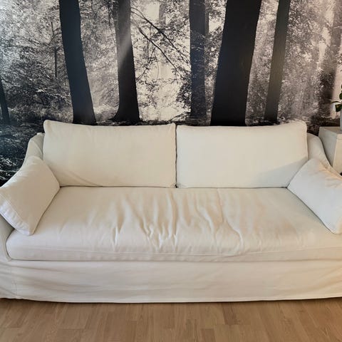 Ikea Backsälen 3-sitssoffa i ljusbeiget tyg.