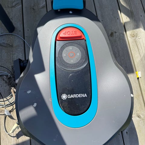 Gardena robotgräsklippare i blått med enkel panel under luckan. Laddstationen ingår också med platta att ställa den på.