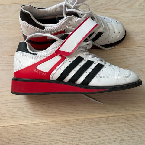 Adidas styrketräningsskor i stl 45 med snörning och stabil sula. För marklyft, squats etc. Använd 1 gång.