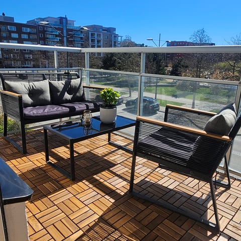 Utegrupp med tre ljusgrå fåtöljer och rektangulärt bord med skiva i härdat glas.