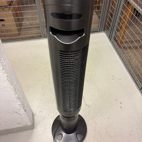 Sandstrøm tornfläkt med digital display och touchknappar upptill för lägen, timer och oscillation. Har smal, hög design som tar lite golvyta och en ljus list runt om.