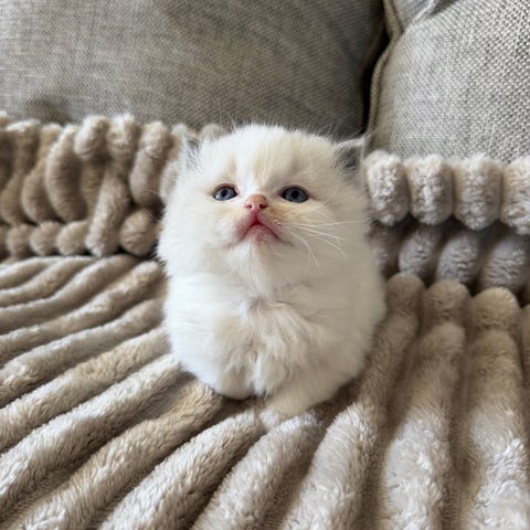 Av vår kull finns nu endast fina Alma kvar. Hon är en liten men tuff tjej med en fantastisk personlighet. Väldigt social, älskar närhet och gos – hennes favoritplats är i famnen, gärna innanför tröjan.