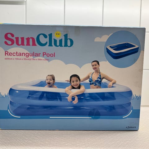 Bestway rektangulär uppblåsbar pool i blått, ca 2,62 m lång. Två luftkammare med vita kanter och mjuka sidor som är sköna att luta sig mot.