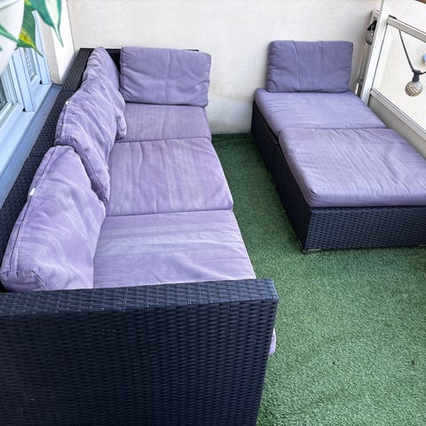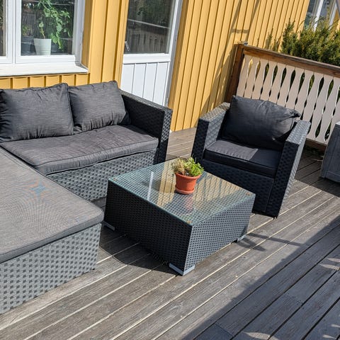 Säljer en stilren och bekväm loungesoffa för uteplats, balkong eller inglasning. Perfekt för avkoppling eller sociala stunder.