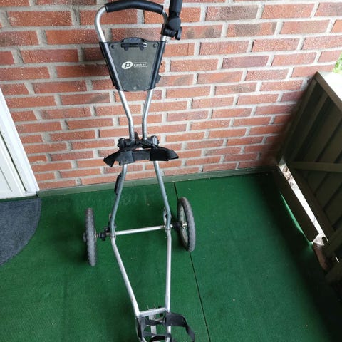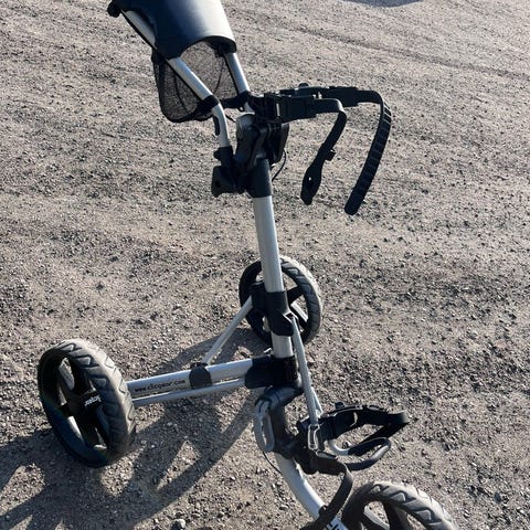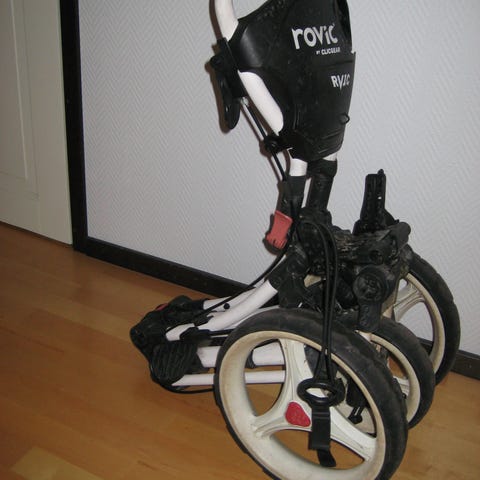 Clicgear trehjulig golfvagn i vitt och svart. Hopfällbar modell med stora hjul, hållare för bag och praktisk konsol upptill. Använd 4 säsonger, i bra skick och absolut noll fel på den. Väldigt nöjd!