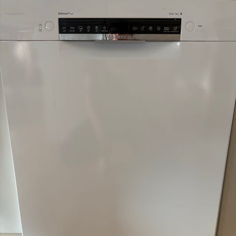 Vit underbyggd diskmaskin från Bosch med frontpanel och tydliga och välfungerande touch touch skärm.