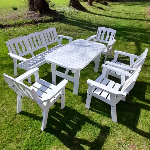 Trädgårdsgrupp i trä med bord, soffa och fåtöljer