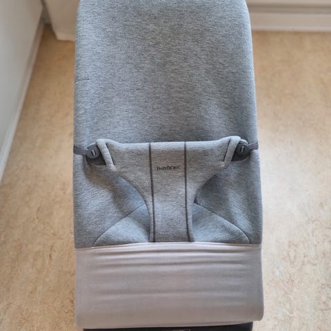 BabyBjörn babysitter i grå färg. Har tre lägesinställningar och enkelt sele framtill