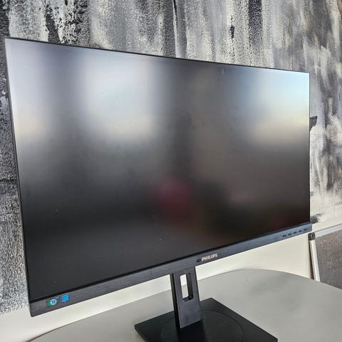 Dell S2721DS 27-tums skärm i svart med höj- och vridbart stativ. Har flera anslutningar på baksidan, bland annat HDMI, DisplayPort och USB.