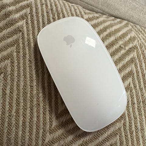 Apple Magic Mouse, trådlös mus i vitt med slät ovansida. Har strömbrytare och sensorer undertill för användning med Mac.