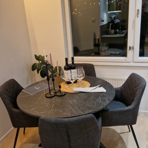 Marmorbord och fyra sammetsstolar