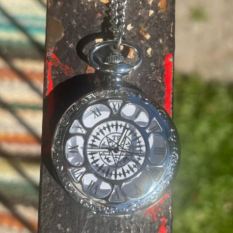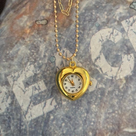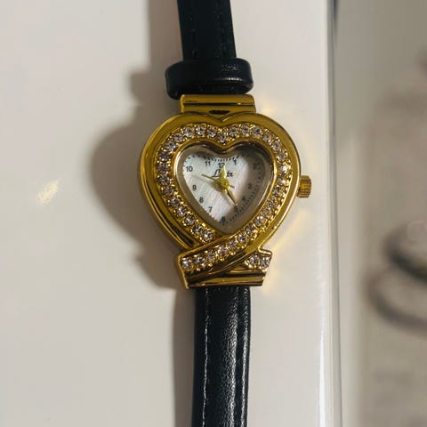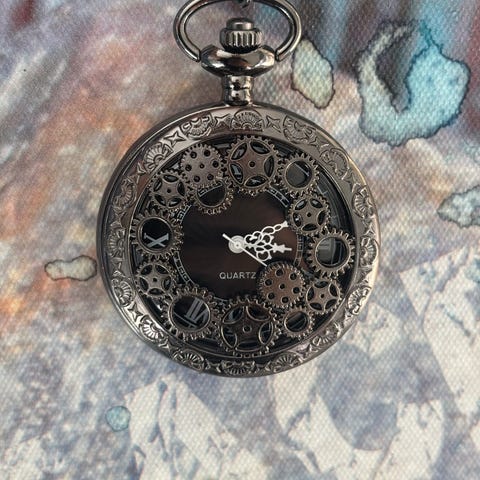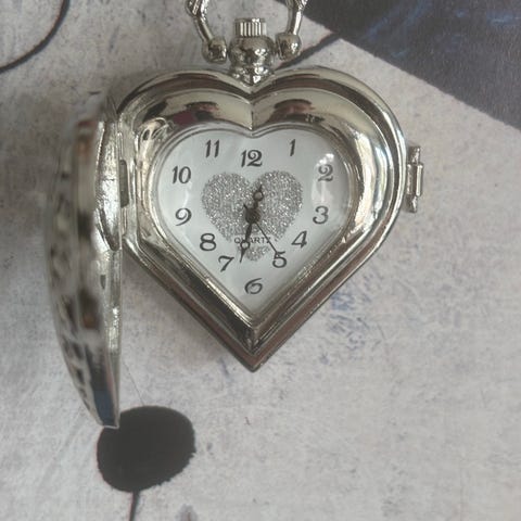 Superfint fickur i bronsfärg med en grön sten centralt i fronten. Vit urtavla med visare i retrostil. Diameter 45mm, Quartz rörelse.