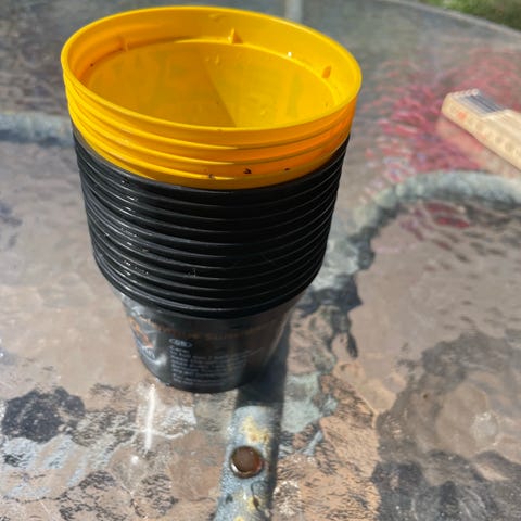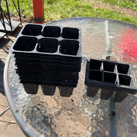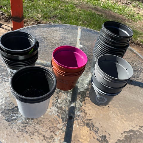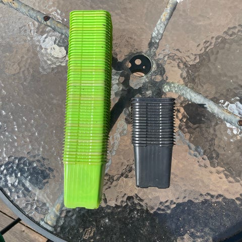 Röda plastspikar som skruvas på PET-flaskor för bevattning av krukväxter eller i trädgården. Flera stycken i samma modell, med spetsig ände som sticks ner i jorden.