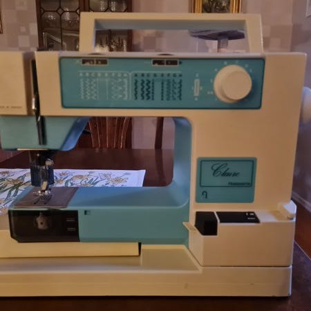 Husqvarna Viking E20 symaskin i vitt med flera sömprogram och enkel ratt för inställningar. Har inbyggd arbetslampa, friarm och förvaringsfack framtill för smådelar och trådspolar.