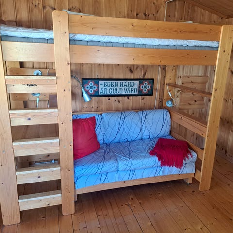 Stabil våningssäng VESTERVIG från Jysk med stege på sidan. Undersängen är bredare än översängen. Tjockare fräscha madrasser (använda med madrassskydd) samt extra foammemory 120 madrass (för extra sovkomfort) till nedre sängen ingår. Madrasserna gick på ca 4500 vid inköp. Allt sparsamt använt. Har stått i gäststuga i ett par år. Säljes då vi inte längre har behov av den.