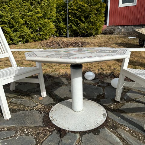 Stort ovalt trädgårdsbord i trä med matchande stolar med ribbade ryggar. Stabil möbelgrupp som passar bra på altan eller uteplats. Bordsskivan har fått sig en smäll så behöver limmas. Bortskänkes mot avhämtning. 4 stolar och ett bord. Bordet går att förlänga med inbyggd iläggskiva.