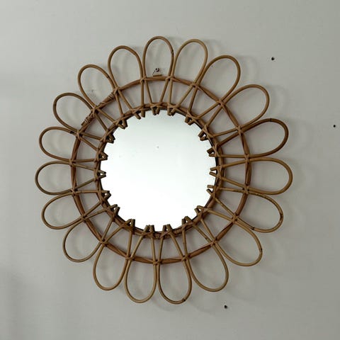 Fin rund väggspegel med ram i ljus bambu som ger en varm och naturlig känsla. Spegeln är ca 40 cm i diameter och passar perfekt i hallen, sovrummet eller som en dekorativ detalj i vardagsrummet.