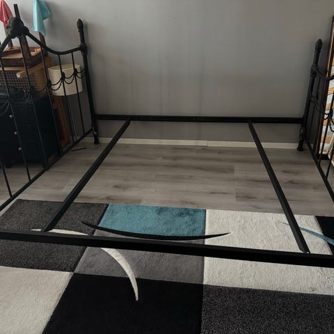 Saljer IKEA SAGSTUA sängram i svart metall, komplett med ribbotten (lamellbottnar).