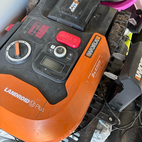Worx Landroid Plus robotgräsklippare i orange med tydlig display och stora reglage på ovansidan. Med på bilderna syns även en rulle begränsningskabel som kan användas till installationen.