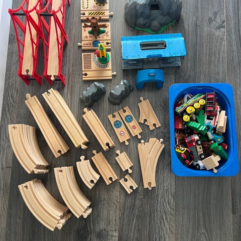 Stor BRIO tågbana i trä med massor av raka och böjda rälsdelar. Följer med flera färgglada tåg, figurer, djur, skyltar och andra små tillbehör till banan. Fins också med IKEA tågdelar. Denna röda tåg på bild 14 låter ( batteridriven)