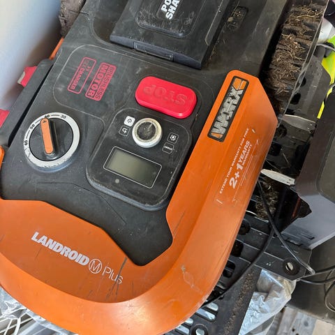 Worx Landroid Plus robotgräsklippare i orange med display och enkla knappar på ovansidan. 5 år gammal. Funkar, ej använd på 1 år. ny begränsningskabel. Märlor finns ej. Laddstation hänger med. Med på bild syns även en rulle begränsningskabel från Genisys på 250 m.