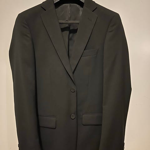 Svart kostym från Dressmann , kavaj i stl 50, med två knappar fram och fickor med lock. Slät baksida och helfodrad insida med innerfickor.