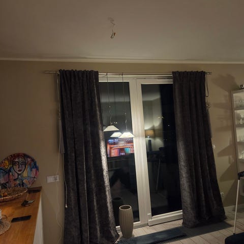 Gardinlängder 2 st med tyg från Designers Guild i färger med limegrönt, brunt, turkost, svart på vit botten. Upphängning är öljetter. Längd t golv från öljett är ca 230 cm