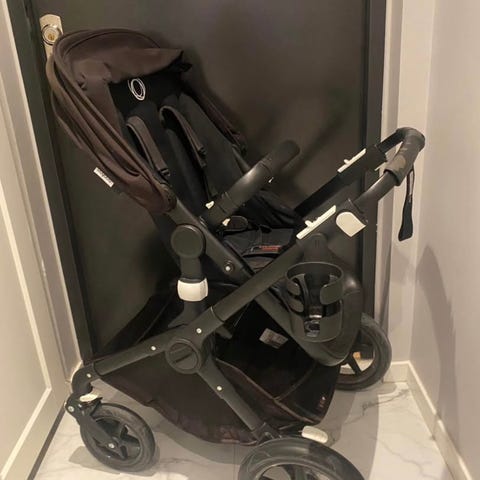 Bugaboo syskonvagn i svart med stor varukorg under. Justerbart handtag och svängbara framhjul som gör den smidig att köra.
