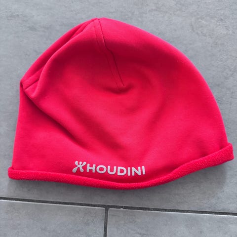 Röd huvtröja från Peak Performance i bomull, stl S. Huva med knappar fram, mudd i ärmslut och nederkant samt stort tryck med loggan på magen.