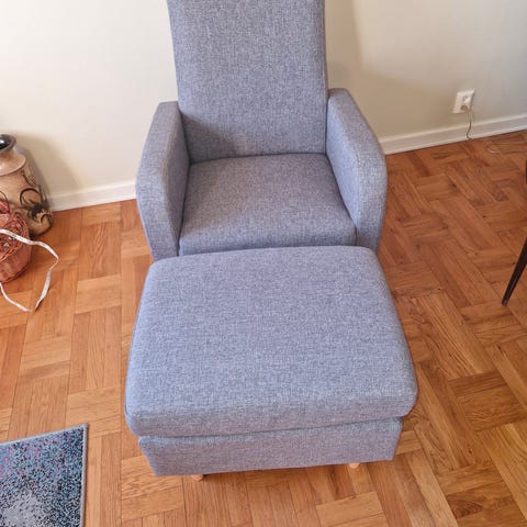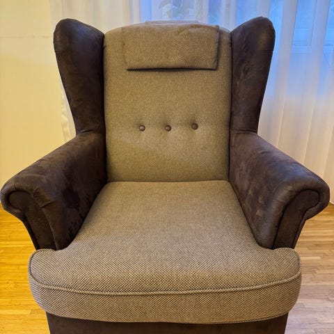 Fåtölj från Mio med bred sits. Har runda mörka träben och nackstöd med metallstöd bakom kudden. Måtten är ca. Tyget heter attractive brown. Tyvärr blev den för stor hos mig. Knappt använd.