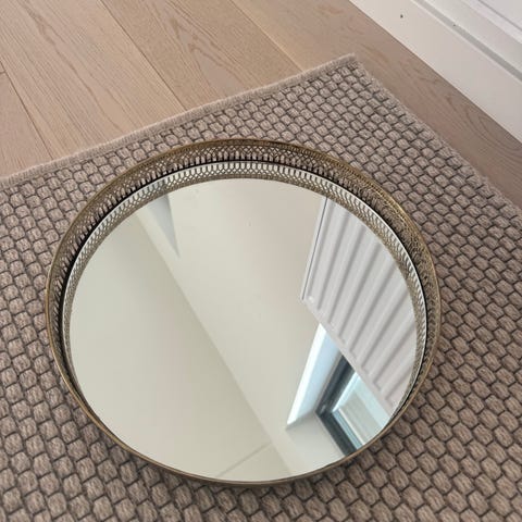 Spegel 60 cm. Upphäng medföljer inte. Har stått lutad på ett skåp. Helt slät baksida.