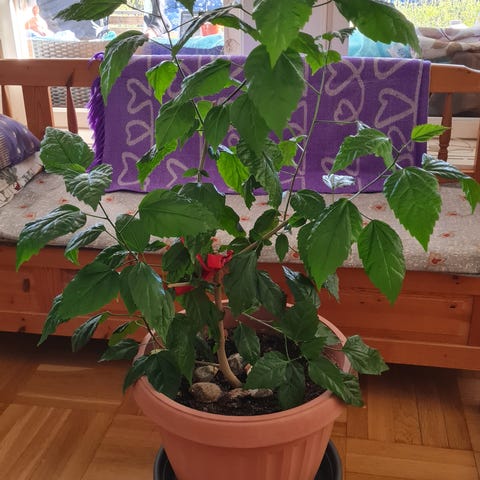 Stor grön krukväxt i dekorativ blå ytterkruka. Flera stammar och mycket blad, står i vanlig blomjord.