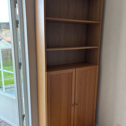 IKEA BILLY/OXBERG bokhylla med 1 fast hyllplan och 4 flyttbara hyllplan. Dörrar nedtill för möjlighet till stängd förvaring, men dessa går också lätt att montera av för den som föredrar det. Nypris 1499kr