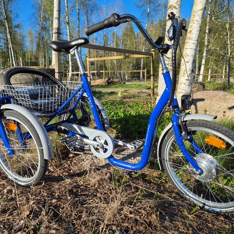 Trehjuling från Skeppshult med stabil ram och 24" hjul, passar unisex. Treväxlad med korg både fram och bak. Lås med en nyckel.