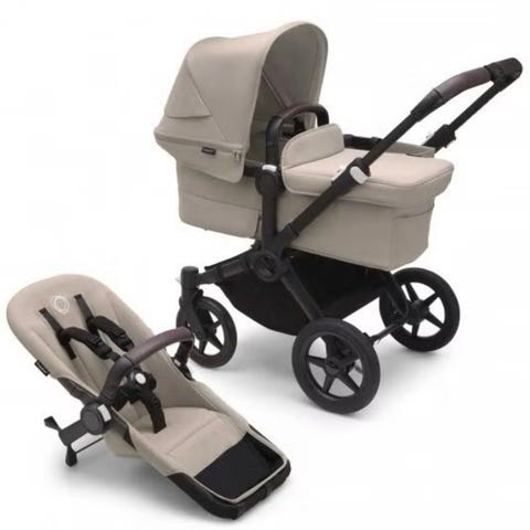 Själva vagnen: Bugaboo Fox (chassi + ram) med både liggdel (för nyfödd) och sittdel (ergonomisk).