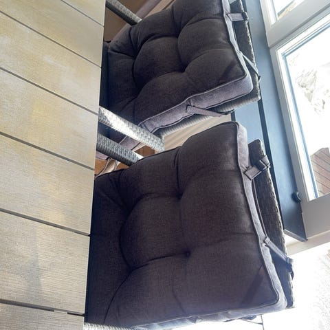 Sköna armstöd och lätt tyg som torkar snabbt på altanen. Vädertåliga.