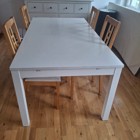 Material: Vit matt laminatskiva kantad med björk, ben i björk