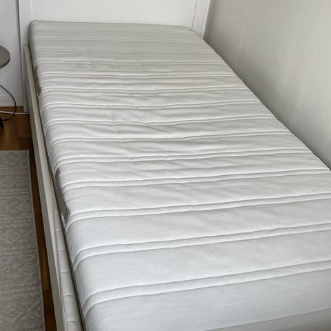 IKEA säng med ribbotten och två madrasser vit